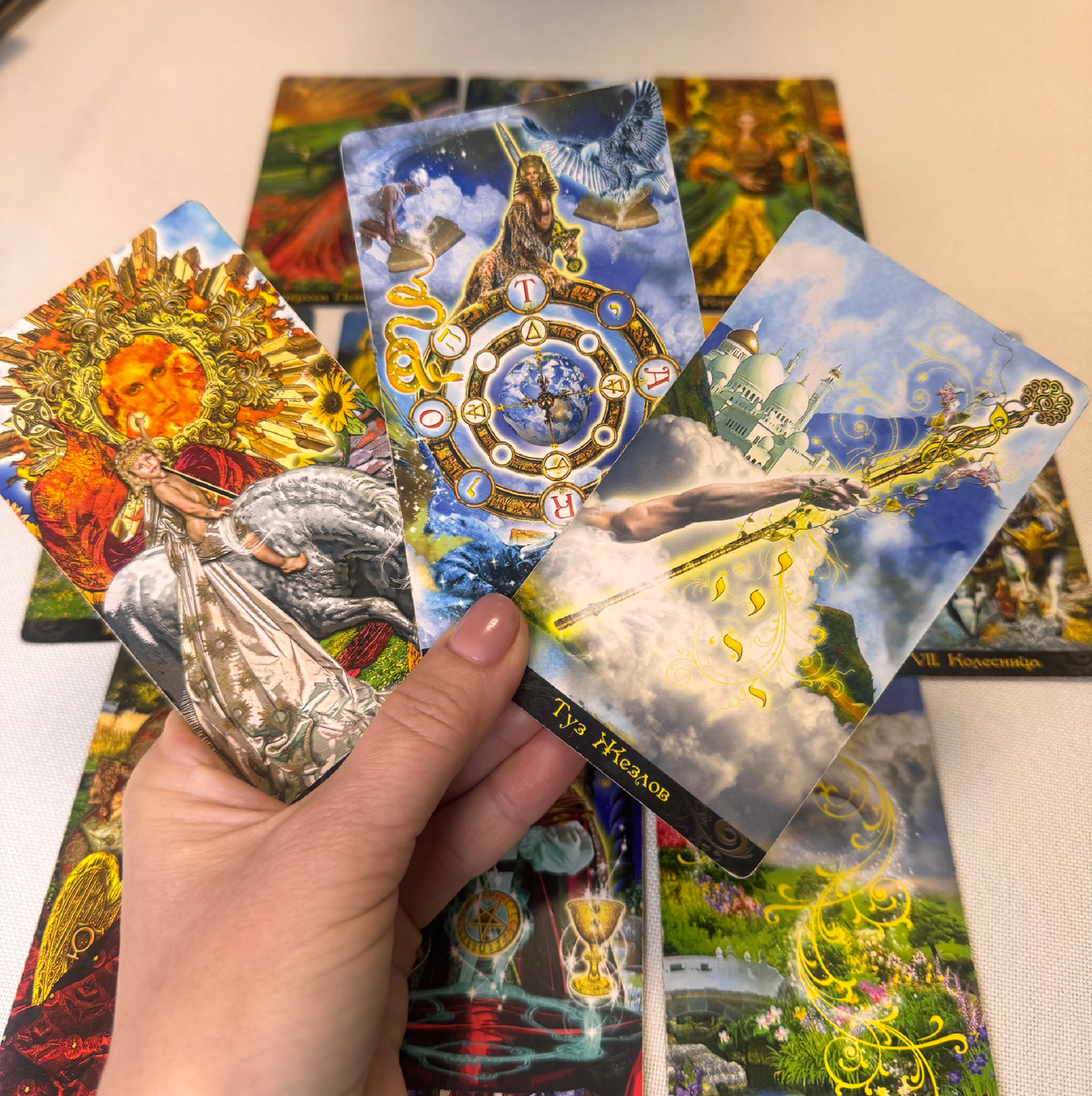 Моя дорогая, я редко вижу такое единодушие карт в предсказании удачи! Солнце — это аркан абсолютного счастья, ясности, успеха и полноты жизни. Это энергия "да" без всяких "но". Колесо Фортуны — это сама судьба, которая поворачивается к тебе своим счастливым ликом. А Туз Жезлов — это вспышка, искра, семя огромной страсти, энтузиазма и новых начинаний.