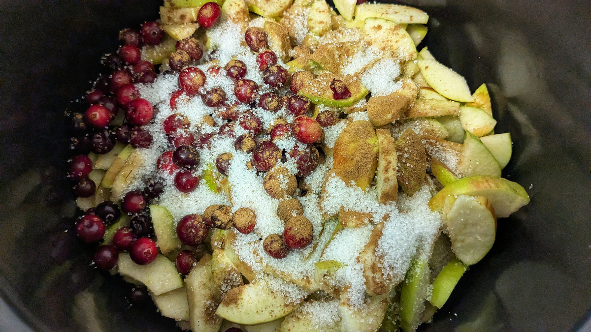 Затем посыпаем корицей и небольшим количеством сахара и перемешиваем, чтобы наши яблоки слегка дали сок. В этот раз добавила горсть клюквы. Можно добавить изюм или другие сушеные ягоды.