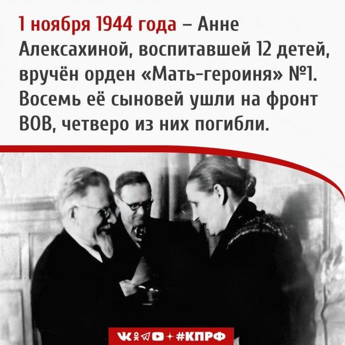 1 ноября 1944 года – Жительнице посёлка Мамонтовка Московской области Анне Алексахиной, воспитавшей 12 детей, в Кремле вручён орден «Мать-героиня» №1 Восемь её сыновей ушли на фронт Великой Отечественной войны, четверо из них погибли. 8 июля 1944 года Президиум Верховного Совета СССР издал указ об учреждении новых наград для матерей. В их числе были почетное звание и орден «Мать-героиня», награждать которым предполагалось матерей, воспитавших десять и более новых граждан. Первое награждением новым орденом состоялось 1 ноября 1944 года в Кремле. Орден «Мать-героиня» №1 с присвоением соответствующего почетного звания был вручен из рук Михаила Ивановича Калинина жительнице поселка Мамонтовка Московской области Анне Савельевне Алексахиной, воспитавшей 12 детей (десять сыновей и двух дочерей). Восемь сыновей Анны ушли на фронт Великой Отечественной войны, четверо из них погибли, защищая Советскую Родину от немецко-фашистских захватчиков. Оставшиеся в живых дети Алексахиной в послевоенные го