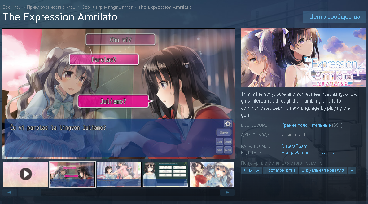 Привет всем, кто интересуется эсперанто и ищет новые способы практиковать язык! Сегодня мы посмотрим на визуальную новеллу «The Expression Amrilato», которая доступна в Steam. Это уникальный проект, где язык эсперанто становится не просто фоном, а полноценной частью геймплея и сюжета. О чём эта игра? Главная героиня, Рин, в один момент обнаруживает себя в совершенно незнакомом месте. Небо здесь странного розового цвета, а всё вокруг — вывески, речь людей — написано и сказано на непонятном языке. Так она понимает, что оказалась в параллельном мире. В этой пугающей и незнакомой ситуации ей на помощь приходит девушка по имени Рука. Она говорит на ломаном японском, но её доброта и желание помочь видны сразу. Так начинается история двух девушек, которые, несмотря на языковой барьер, пытаются понять друг друга и подружиться. Эсперанто как ключевой элемент Язык, на котором говорят в этом странном мире, называется «Джулиамо». Игроки эсперанто сразу его узнают — это и есть наш любимый междунаро