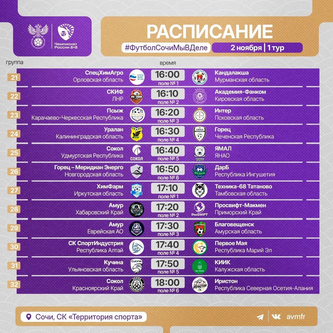 Всероссийские соревнования в Сочи. Футбольный турнир чемпионата России по футболу в формате 8 × 8, сегодня, 2 ноября, начинаются матчи «Горец» — «Медериан Энерго» сыграет свой футбольный матч в 16:50, прямая трансляция. https://vkvideo.ru/video-214830358_456242667. Болеем за нашу Новгородскую команду и желаем удачи и успехов
