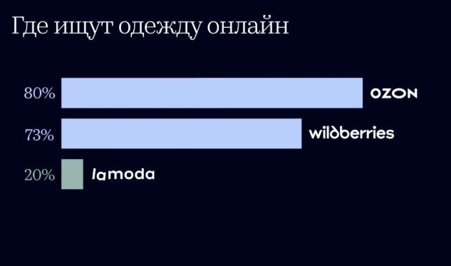 Российский fashion-рынок сейчас сосредоточен вокруг крупнейших маркетплейсов: одежду, обувь и аксессуары там за последний год покупали 69% респондентов. 8 из 10 россиян покупают fashion-товары на Ozon. Wildberries упомянули 7 из 10 респондентов. Lamoda и Яндекс Маркет, набрали по 20–21% голосов.