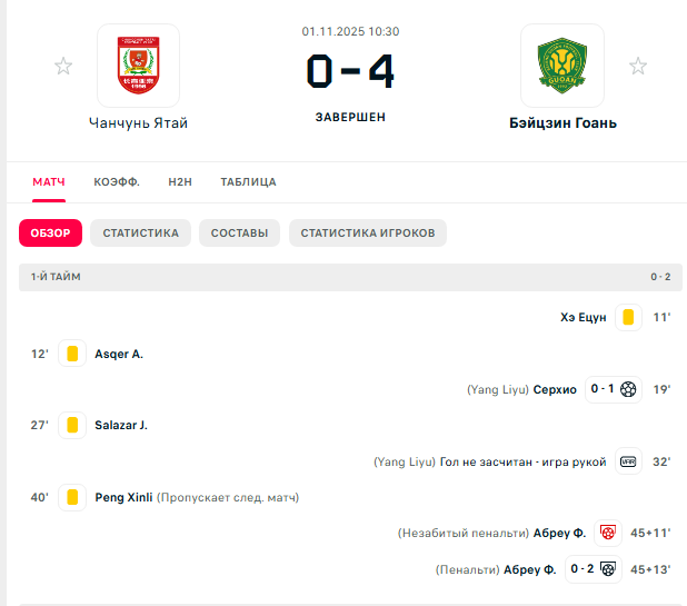 Иногда я под настроение и от нечего делать захожу поиграть на ставках по своему любимому футболу. Деньги там в принципе символические. Просто игра ради игры. Ну и поудивляться хочется на старости лет как сейчас изменилась сама концепция самой популярной игры в мире. Вот набрёл и на китайский чемпионат. Случается это очень редко. Но на тот час более значимых игр ещё не было. Как видите из скрина попытка была сделана на матч суперлиги Чанчунь Ятай - Бэйцзин Гоань. В середине первого тайма сделал ставку на меньше 1,5 гола ( в первом тайме ). И понервничать пришлось уже на 32 минуте. Как видно по фото - гости забили второй мяч, но он был отменён. Cистема VAR сработала за меня. И я вздохнул спокойно. Время первой половины игры завершилось. Но судья добавил ещё аж 7 минут! Но и они практически закончились, когда был назначен пенальти в ворота хозяев. Я приуныл. Но случилось чудо. Нападающий гостей анголец Абреу шанс не использовал. Можно было бы выдохнуть...Но я забыл что ведь сейчас правя