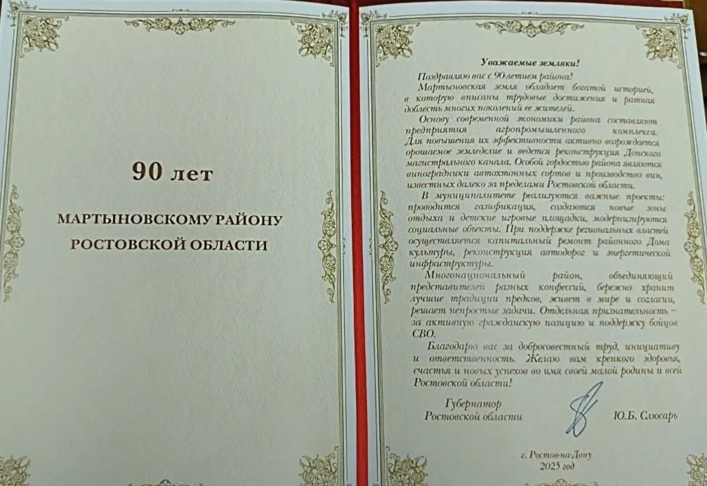Уважаемые земляки! Поздравляю вас с 90-летием района! Мартыновская земля обладает богатой историей, в которую вписаны трудовые достижения и ратная доблесть многих поколений ее жителей. Основу современной экономики района составляют предприятия агропромышленного комплекса. Для повышения их эффективности активно возрождается орошаемое земледелие и ведется реконструкция Донского магистрального канала. Особой гордостью района являются виноградники автохтонных сортов и производство вин, известных далеко за пределами Ростовской области. В муниципалитете реализуются важные проекты: проводится газификация, создаются новые зоны отдыха и детские игровые площадки, модернизируются социальные объекты. При поддержке региональных властей осуществляется капитальный ремонт районного Дома культуры, реконструкция автодорог и энергетической инфраструктуры. Многонациональный район, объединяющий представителей разных профессий, бережно хранит лучшие традиции предков, живет в мире и согласии, решает непросты