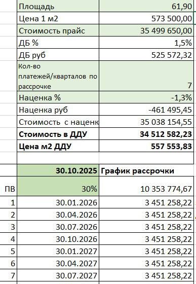 🏗️Рассрочки на новостройки По просьбе клиента делала расчет по рассрочке в одном из жилых проектов, который недавно стартовал от известного застройщика в бизнес классе. 🧐Интересен тот факт, что в одной очереди строительства по рассрочке действует «скидка» к цене, а в другой, наоборот, - «наценка». Дьявол, как всегда, скрывается в цене квадратного метра. Так называемая «базовая цена», которая может быть завышена, отсюда и «скидки». Прикрепляю наши расчеты на одну и ту же квартиру, но с разным первоначальным взносом и сроками платежей. Вариант, 1▪️где ПВ 30% - самая длинная рассрочка на 7 кварталов. 2▪️где ПВ 50% - рассрочка на год. На размер «скидки» влияют 2 фактора: это сумма ПВ и срок рассрочки. 🏢Застройщики сейчас активно внедряют рассрочки, пока их не зарегулировали в Ц.Б., пообещав учитывать в кредитной истории и финансовой нагрузке заемщика.
