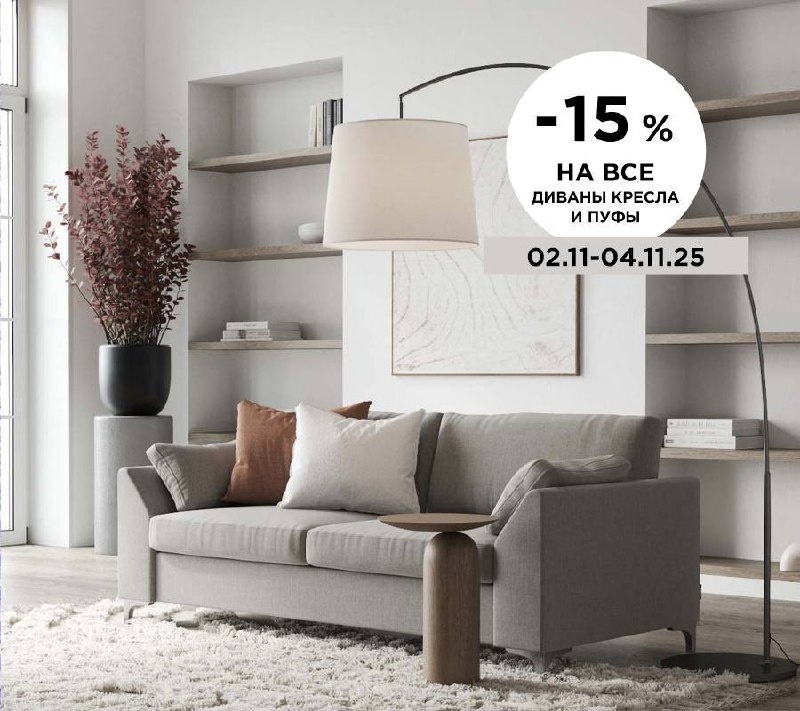 🌟В TheFurny -15% на все модели диванов, кресел и пуфов. Подарите вашим близким комфорт и качество — выберите диван, кресло или пуф, которые станут любимым местом в доме. С 02.11.2025 по 04.11.2025 на все диваны, кресла и пуфы действует скидка -15%! Акция действует в розничных салонах и на сайте. Реклама: ИП Курятников Константин Сергеевич. ИНН 771994230679. ОГРН 317774600582162 Межрайонная ИФНС № 46 по г. Москве 12.12.2017