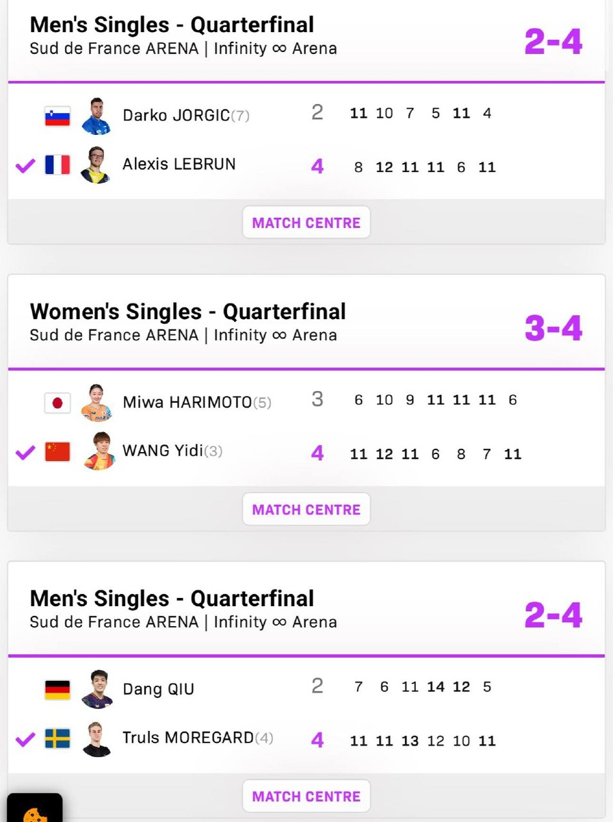 В ответ на пост 😃 Развязка WTT Champions Montpellier 2025! Алекси продолжает страховать семью Лебрун и вместо действующего чемпиона прорываться вперёд, осталось два сложных шага. Трулс Морегард готов противостоять безумной французской трибуне и будет искать ключики обратить эту энергию себя в помощь. Невероятно интригующие мужские противостояния и интересная женская дуэль Винтер (героически отыгравшаяся с 0:3 в 1/4) против Шин Юбин. Жаль упустили матч Хашимото - Ван Иди. Время по МСК +2. Полуфиналы и финалы сегодня!