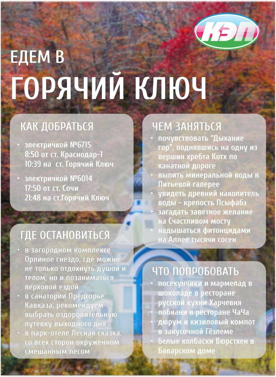 Впереди длинные ноябрьские выходные, а значит самое время сесть на электричку КЭП и отправиться к Воротам Кавказа. Именно так называют курорт Горячий Ключ – место, с трех сторон окруженное горными хребтами, богатое целебными минеральными водами, живописными пейзажами и природными достопримечательностями