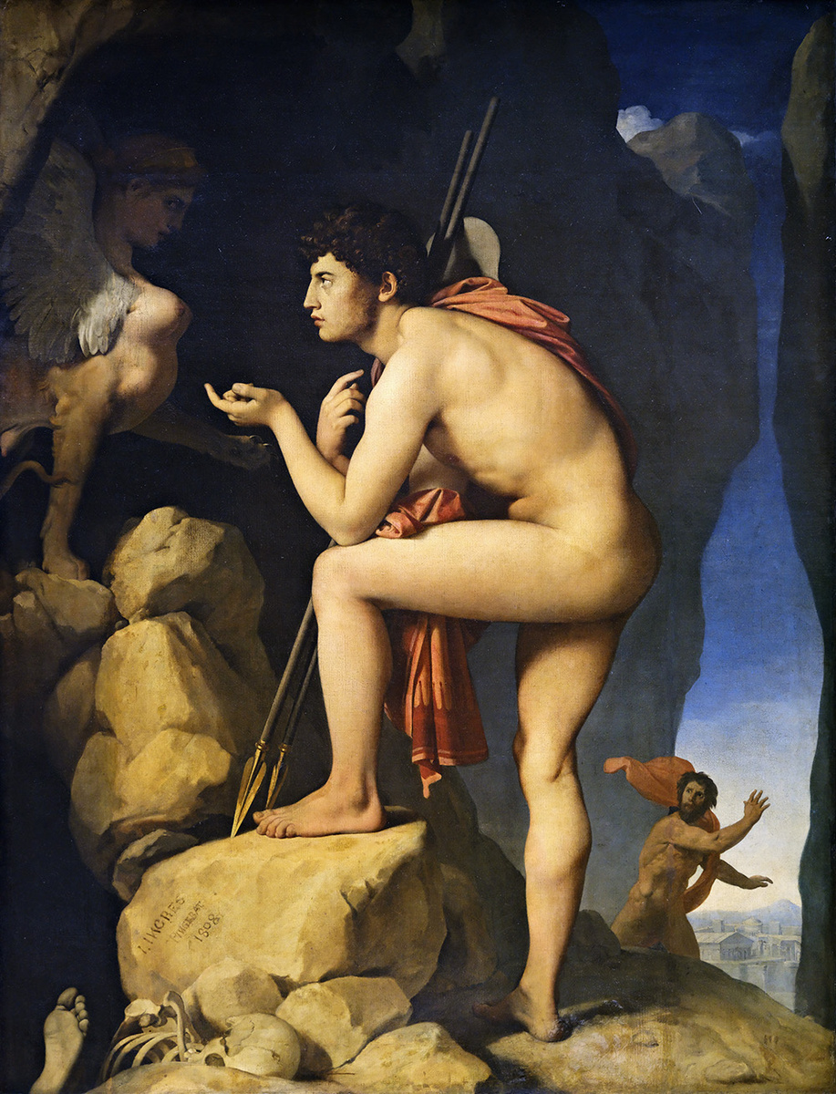 На этой картине Жана Огюста Доминика Энгра (1780–1867) Эдип размышляет над ответом на загадку Сфинкса. Он окружён костями несчастных, давших неправильный ответ. Внизу виден взволнованный человек, пытающийся то ли спасти несчастного, то ли рассказывающий всем о новой жертве. «Всякий незнающий, ты — бич своей плоти и крови, мёртвый под землёй и живой здесь, наверху, и двойной плеть проклятия твоей матери и твоего отца изгонят тебя с этой земли». «Царь Эдип» Софокла, ок. 430 г. н. э. Эдип, сын фиванского царя Лайя и его жены Иокасты, был выброшен младенцем на улицу после того, как было предсказано, что он убьет отца и женится на матери. Оставленный умирать, он был найден и волей случая попал к бездетному коринфскому царю Полибу. Эдип рос, не зная о своем происхождении, и, пока не посетил Дельфийского Оракула, не знал и о пророчестве. Когда ему рассказали, он ужаснулся и решил не возвращаться домой, тем самым запустив цепь событий, которых больше всего хотел избежать. Покинув Дельфы,