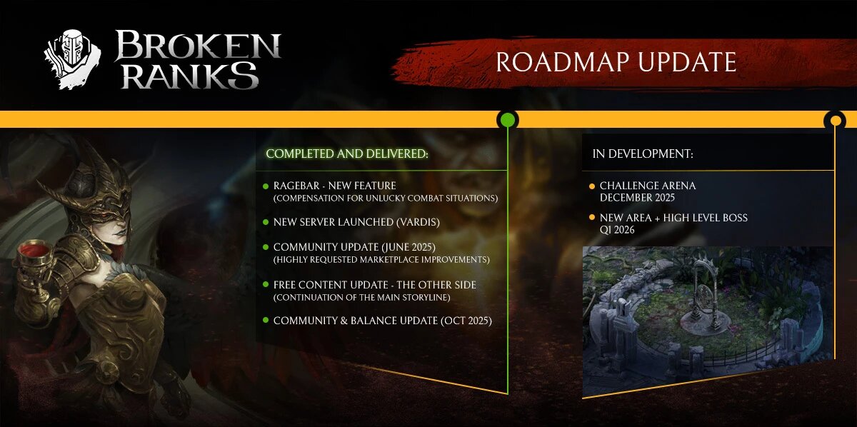 На конец этого года у разработчиков польской изометрической MMORPG Broken Ranks запланирован выпуск обновления, которое предложит фанатам новый тип активности в декабре — Арена Испытаний. В своем блоге команда Whitemoon Games поделилась основными особенностями нового режима. Арена испытаний представляет собой "игру в игре" с элементами жанра roguelike. Этот режим создан для игроков, которые ценят не только сам бой, но и тактические решения, принимаемые по ходу прохождения. Ниже представлены ключевые особенности: Также команда разработчиков рассказала об изменениях в дорожной карте развития игры. Переработка питомцев и другие пункты были отложены на начало 2026 года. Приоритетом на данный момент являются новый регион с высокоуровневым боссом. Разработчики уверяют, что на 2026 год запланированы и другие "весьма крупные" обновления. https://www.youtube.com/watch?v=p9dpRGk9O7U