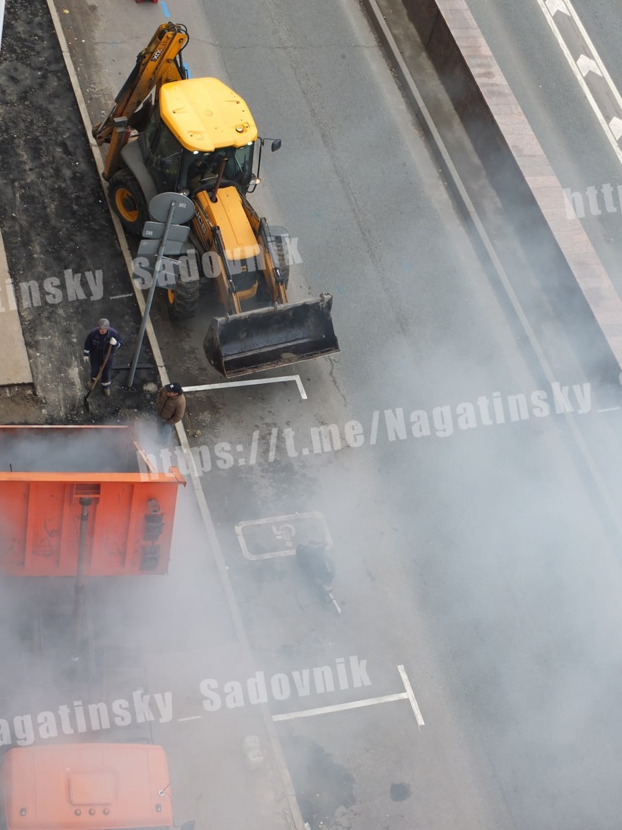Наконец-то восстанавливают асфальт на тротуаре вдоль дублёра Каширского шоссе после долгой укладки электросетей в траншею.