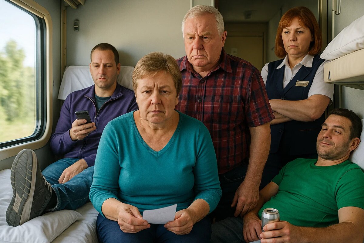 На её полке — той самой нижней, за которую они переплатили почти треть билета — развалился мужик лет тридцати. Ноги в грязных кроссовках лежали на её подушке. В руке — банка пенного, мокрая от конденсата. Рядом, на месте Сергея, сидел второй, постарше, с телефоном. Оба устроились всерьёз.
