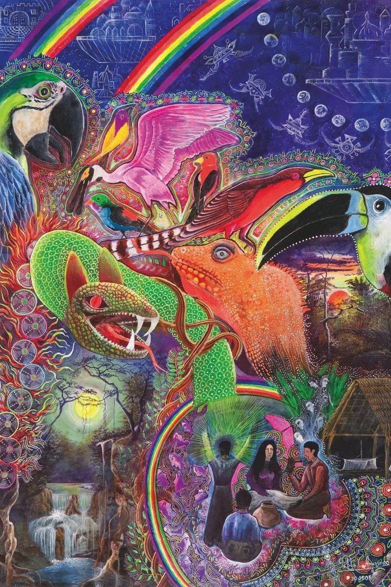 Рассмотрим трех современных художников, которые являются яркими представителями этого направления! У всех абсолютно свой неповторимый стиль и любопытная биография. Первым на очереди у нас идет мистический перуанец Пабло Сезар Амаринго. Всю жизнь был шаманом, вегеталистом (получающим магическую силу и видения с помощью аяуаски). Долго время сводил концы с концами, продавая свои картины туристам и преподавая английский. Однако вскоре на него обратили внимание Деннис МакКенна и Луис Эдуардо Луна. Они поспособствовали распостранению его работ. Включали в публикации, книги о шаманизме и мистике, а также, работы перуанца были включены в документальный фильм про аяуаску. Свои работы Пабло часто рисовал после принятия таинственного напитка, оно и видно, как говорится. Работы, наполненные колоритом Амазонии, обрядов и яркий деталей. Алекс Грей получил свою фамилию после яркого перфоманса в 1970х. Он покрасил свое тело в белый (янь), а его жена в черный (инь), они встретились посередине комнаты