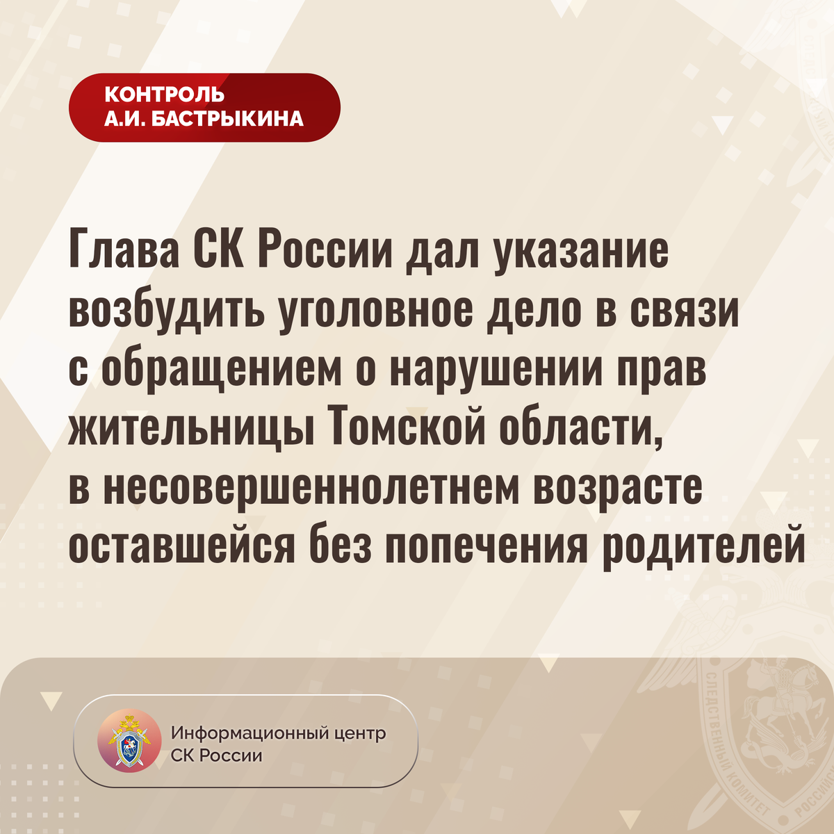 Глава СК России дал указание возбудить уголовное дело в связи с обращением о нарушении прав жительницы Томской области