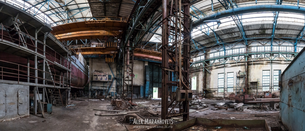 Проехав «сталинки» и «хрущёвки» посёлка имени Кирова, свернули на улицу Кирова и доехали до памятника С.М. Кирову. От него поворот к КПП, где называем кодовое слово, и нас пропускают. Мы на территории остановленного в конце 90х и ныне заброшенного судостроительного завода имени Кирова в Хабаровске. Останавливаемся у большого кирпичного цеха, выходим из машины и находим приоткрытую дверь. Входим... Три судна, выстроившись в ряд, разной степени готовности — три железных исполина, покрытых осыпающимися струпьями краски, побеждённой ржавчиной. Детали судов: винты, оборудование, силовые элементы — они уже никогда не будут установлены. Обломки информационных плакатов, табло с застывшими цифрами рабочего процесса, пишущая машинка и сварочные аппараты — словно застывшие во времени осколки ушедшей эпохи. В 1931 году в Осиповском затоне на реке Амур в Хабаровске построили судостроительный завод — первое подобное предприятие в регионе. Строили ускоренными темпами — всё из дерева. Завод вошёл в с