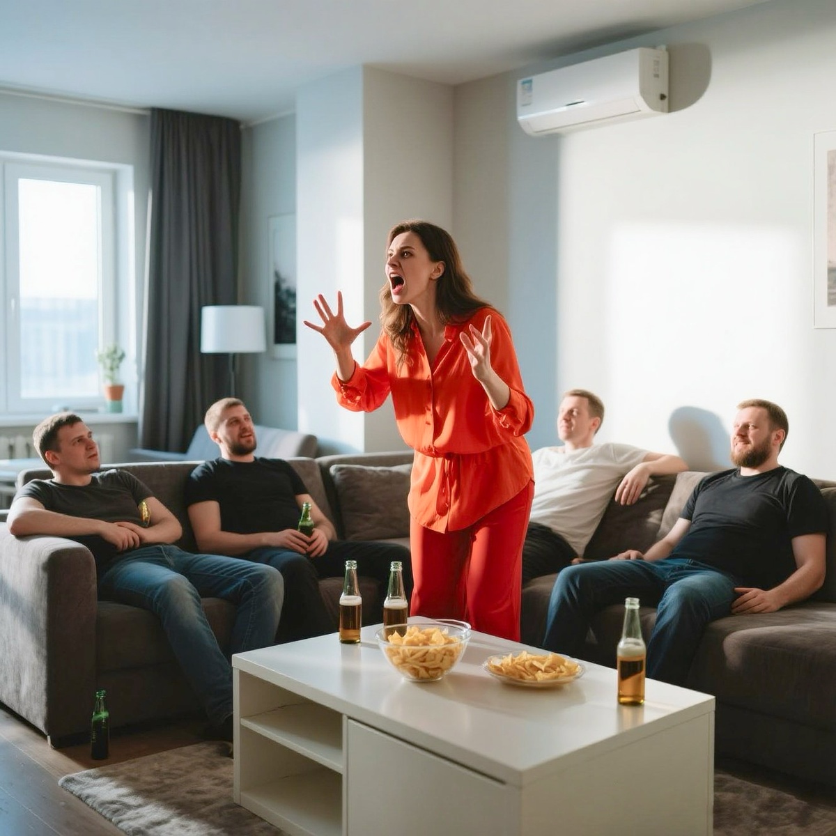 В восемь вечера начали приходить гости. Первым, как всегда, был Серёга — шумный, с вечно красным лицом и громким смехом. Следом Дима с Пашей. Последним Олег, тихий бухгалтер, который почти не разговаривал, только смотрел футбол и методично пил пиво.