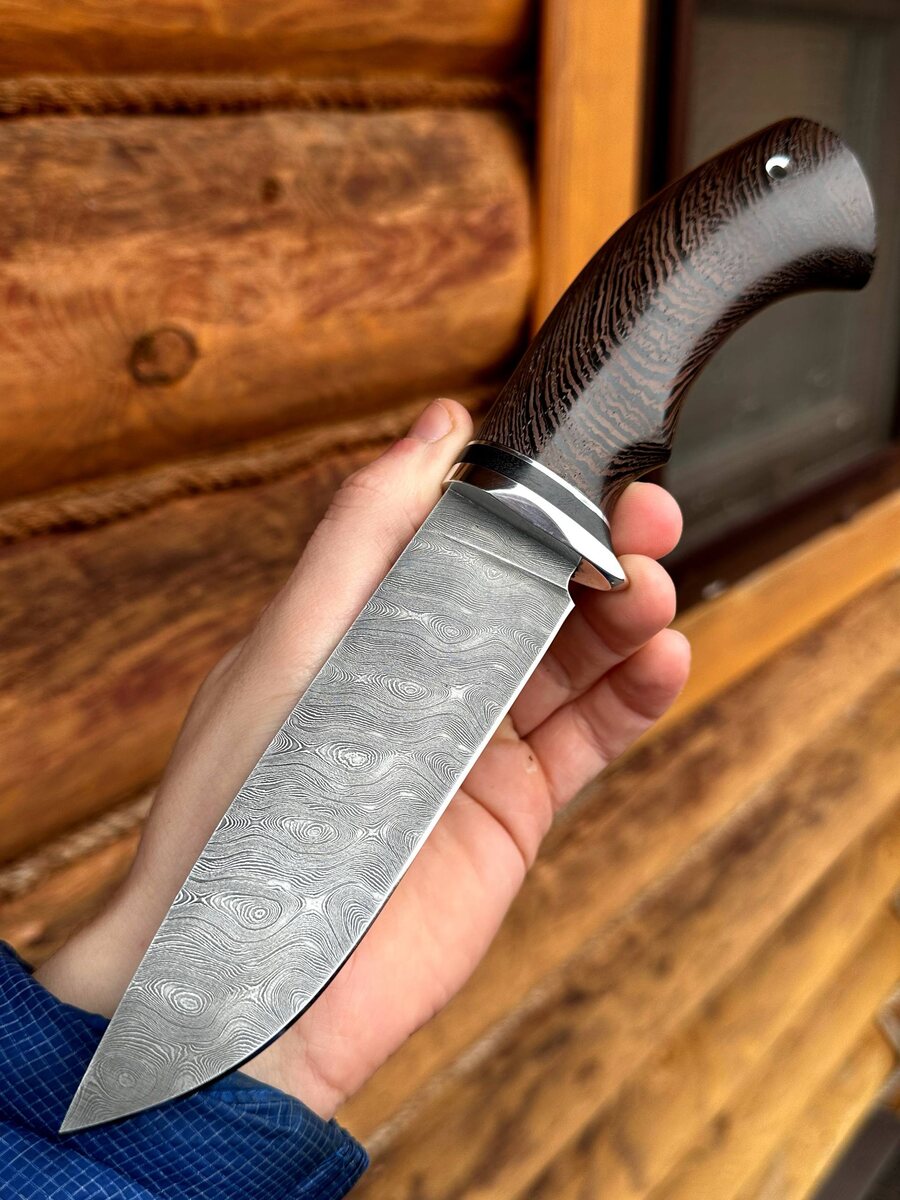 Нож «Нептун» — ручная работа из дамасской стали (950 слоев). Такой клинок не только впечатляет внешне, но и бреет по-настоящему: режет без усилий, как бритва.