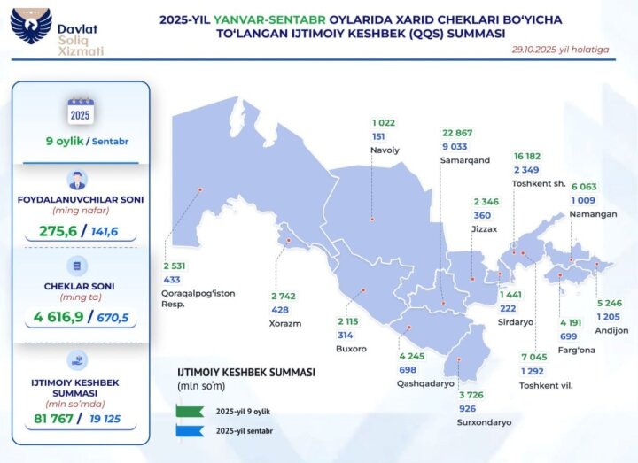 В пресс-службе Налогового комитета Республики Узбекистан сообщили, что малообеспеченным семьям, включённым в "Единый реестр социальной защиты", продолжает выплачиваться социальный кешбэк по налогу на добавленную стоимость. По данным ведомства, в январе-сентябре 2025 года 275 539 потребителям возвращено почти 81,8 млрд сумов.
