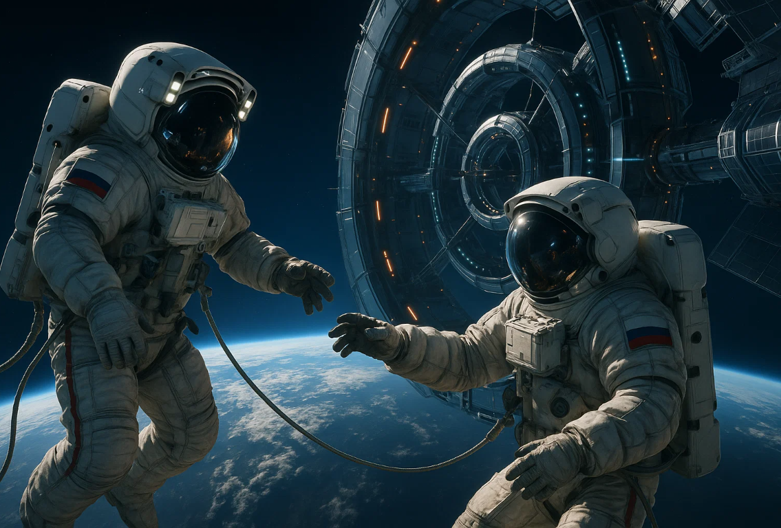 Вблизи гигантской орбитальной станции, сверкающей металлом и светом, парят российские космонавты. Их скафандры — воплощение передовых технологий, а флаги на плечах напоминают о стране, ставшей лидером новой космической эпохи. Под ними медленно вращается Земля — голубая, живая, родная. Станция «Союз-Орбита» — гордость Российской Федерации, центр управления миссиями, исследовательская лаборатория и дом для десятков учёных. Здесь разрабатываются двигатели для межзвёздных полётов и системы жизнеобеспечения будущих колоний. Космонавты выполняют сложные работы за бортом, проверяя оборудование перед запуском экспедиции к Юпитеру. Их движения точны и слаженны — каждое действие отточено годами тренировок. В их шлемах отражается свет Земли и холодные звёзды, будто соединяя прошлое и будущее. Это не просто миссия — это шаг человечества к новой эре, где российская наука вновь открывает дорогу к бесконечности космоса.