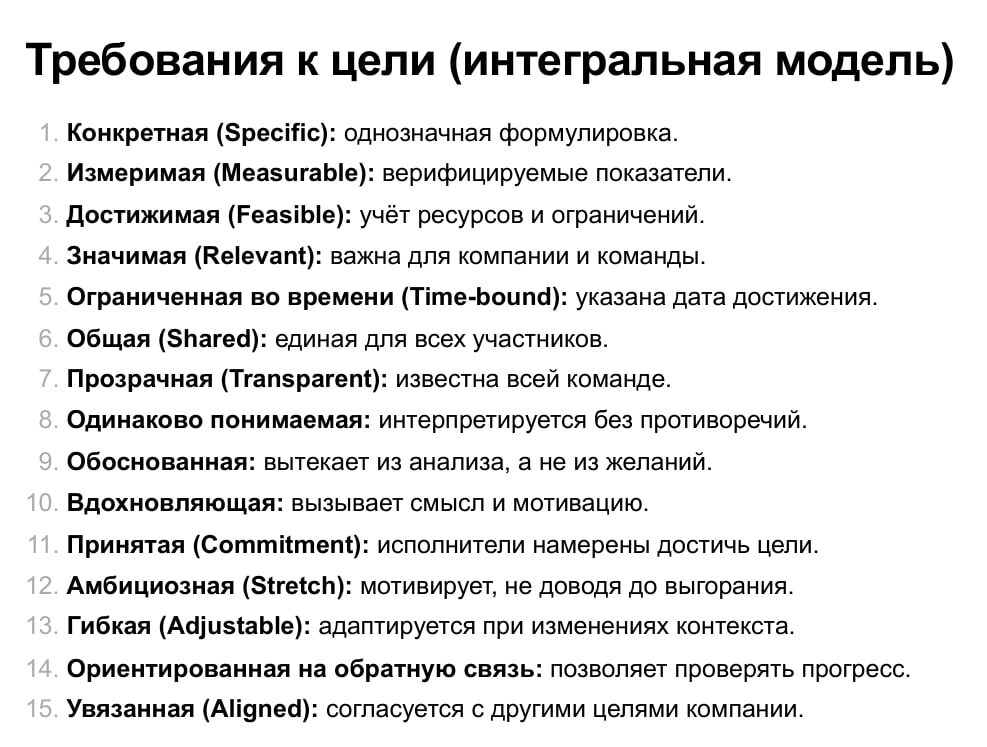 Всем привет, я закончил свои первые 4 занятия на курсе Стратоплана "Команда" Успели изучить: 1) Целеполагание 2) Управление приоритетами 3) Работа с ресурсным состоянием 4) Основы репортинга для Лидов Посмотрели на каждую из тем как с точки зрения теории, так и позанимались на практике. Какую-то часть теории я уже знал благодаря курсу по "Управлению ИТ-проектами" (вчера мне как раз пришел диплом), но где-то половина материала оказалась вообще новой. Круто, что под каждую из тем был свой эксперт, чувствовалась экспертиза по каждой теме, а вот привыкать каждый раз к новому преподавателю требовалось время. Кроме того, постараюсь делиться конспектами по некоторой части курса. Их я пишу в хаотичном виде, но привожу в порядок с помощью ИИ, так что они с небольшим "металлическим" привкусом Делюсь, наверное, самым полезным, из того, что узнал на первом занятии. Оказалось, что для хорошей цели на всегда хватает просто SMART-подхода, когда увидел список из 15 пунктов хорошей цели - был немн