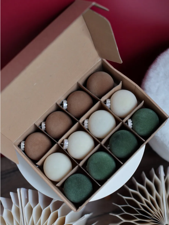 Бархатные елочные шары — это настоящая находка для тех, кто ценит элегантность и уют в новогоднем декоре. Набор из 12 шаров в трех гармоничных цветах — молочном, зеленом и коричневом — создает сдержанную и стильную цветовую гамму. Бархатная текстура придает шарам особый шарм и тактильную приятность.