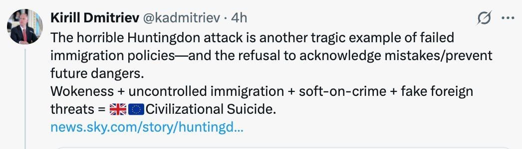 π€‘ Β«Π‘ΡΠΎΡΠ½Π°Ρ Π½ΠΎΠ²ΠΎΡΡΡ!Β»: ΠΠΈΡΠΈΠ»Π» ΠΠΌΠΈΡΡΠΈΠ΅Π² ΠΏΡΠΎΠΊΠΎΠΌΠΌΠ΅Π½ΡΠΈΡΠΎΠ²Π°Π» ΠΈ ΠΎΡΡΠ΄ΠΈΠ» Π½Π°ΠΏΠ°Π΄Π΅Π½ΠΈΠ΅ ΠΌΠΈΠ³ΡΠ°Π½ΡΠΎΠ² ΠΈ ΠΏΠΎΠ½ΠΎΠΆΠΎΠ²ΡΠΈΠ½Ρ Π² ΠΡΠΈΡΠ°Π½ΠΈΠΈ "Π£ΠΆΠ°ΡΠ½ΠΎΠ΅ Π½Π°ΠΏΠ°Π΄Π΅Π½ΠΈΠ΅ Π² Π₯Π°Π½ΡΠΈΠ½Π³Π΄ΠΎΠ½Π΅ β Π΅ΡΡ ΠΎΠ΄ΠΈΠ½ ΡΡΠ°Π³ΠΈΡΠ΅ΡΠΊΠΈΠΉ ΠΏΡΠΈΠΌΠ΅Ρ ΠΏΡΠΎΠ²Π°Π»Π° ΠΌΠΈΠ³ΡΠ°ΡΠΈΠΎΠ½Π½ΠΎΠΉ ΠΏΠΎΠ»ΠΈΡΠΈΠΊΠΈ ΠΈ ΠΎΡΠΊΠ°Π·Π° ΠΏΡΠΈΠ·Π½Π°ΡΡ ΠΎΡΠΈΠ±ΠΊΠΈ ΠΈΠ»ΠΈ ΠΏΡΠ΅Π΄ΠΎΡΠ²ΡΠ°ΡΠΈΡΡ Π±ΡΠ΄ΡΡΠΈΠ΅ ΡΠ³ΡΠΎΠ·Ρ. "ΠΡΠΎΠ³ΡΠ΅ΡΡΠΈΠ²Π½ΠΎΡΡΡ" + Π½Π΅ΠΊΠΎΠ½ΡΡΠΎΠ»ΠΈΡΡΠ΅ΠΌΠ°Ρ ΠΌΠΈΠ³ΡΠ°ΡΠΈΡ + ΠΌΡΠ³ΠΊΠΎΡΡΡ ΠΊ ΠΏΡΠ΅ΡΡΡΠΏΠ½ΠΈΠΊΠ°ΠΌ + ΡΠ°Π»ΡΡΠΈΠ²ΡΠ΅ Π²Π½Π΅ΡΠ½ΠΈΠ΅ ΡΠ³ΡΠΎΠ·Ρ = Π΅Π²ΡΠΎΠΏΠ΅ΠΉΡΠΊΠΎΠ΅ ΡΠΈΠ²ΠΈΠ»ΠΈΠ·Π°ΡΠΈΠΎΠ½Π½ΠΎΠ΅ ΡΠ°ΠΌΠΎΡΠ±ΠΈΠΉΡΡΠ²ΠΎ", β Π½Π°ΠΏΠΈΡΠ°Π» ΡΠΏΠ΅ΡΠΏΡΠ΅Π΄ΡΡΠ°Π²ΠΈΡΠ΅Π»Ρ ΠΏΡΠ΅Π·ΠΈΠ΄Π΅Π½ΡΠ° Π Π€. ΠΠ°Π±Π°Π²Π½ΠΎ Π½Π°Π±Π»ΡΠ΄Π°ΡΡ, ΠΊΠ°ΠΊ ΡΠΎΡΡΠΈΠΉΡΠΊΠΈΠ΅ ΡΠ»ΠΈΡΠ°ΡΠΈΠΈ Π±Π΅ΡΠΏΠΎΠΊΠΎΡΡΡΡ ΠΎ "ΡΠ°ΠΌΠΎΡΠ±ΠΈΠΉΡΡΠ²Π΅Π½Π½ΠΎΠΉ" ΠΌΠΈΠ³ΡΠ°ΡΠΈΠΎΠ½Π½ΠΎΠΉ ΠΏΠΎΠ»ΠΈΡΠΈΠΊΠ΅, ΠΎΡΠ½ΠΎΠ²Π°Π½Π½ΠΎΠΉ Π½Π° ΠΊΡΠ»ΡΡΠ΅ ΠΌΡΠ»ΡΡΠΈΠΊΡΠ»ΡΡΡΡΠ°Π»ΠΈΠ·ΠΌΠ°, ΠΏΡΠΈ ΡΡΠΎΠΌ ΡΡΡΡΠ°ΠΈΠ²Π°Ρ Π² Π ΠΎΡΡΠΈΠΈ ΡΠΎΠΆΠ΅ ΡΠ°ΠΌΠΎΠ΅. ΠΠ°ΠΏΠΎΠΌΠ½Ρ, Π½Π° Π΄Π½ΡΡ