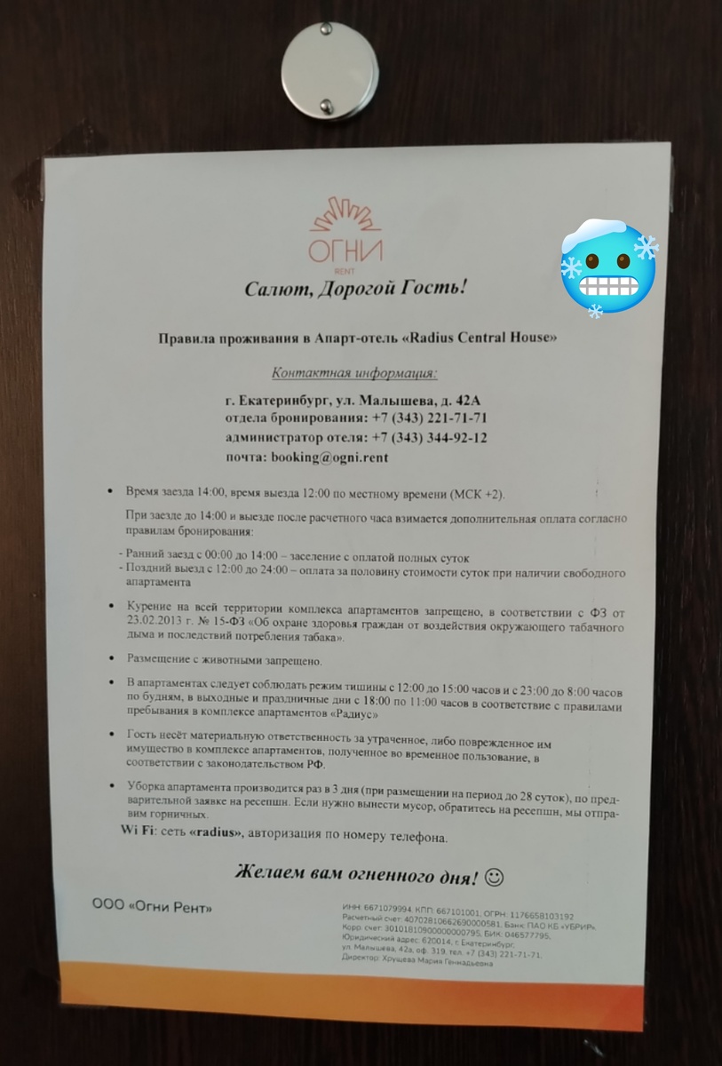 Не могу оставить без внимания отель "Огни Rent" 🥶 Где же огонь 😂? Если в номере температура как на улице 🫤 🥶🌬️🔥 Кричащий отзыв читайте далее 👇 На длинные выходные мы даем себе отдохнуть, меняя место дислокации. И вот сегодня, 2 ноября 2025 г., мы решили погулять по Екатеринбургу. 💥💥💥 Забранировали заранее двухместный номер Studio Business с полной предоплатой (подземный паркинг включен в стоимость). За сутки мы заплатили 5130 р. В номере: - вместительный шкаф-купе (дополнительно на полке оставлены две подушки, белые тапочки), - полноценная кухня (плита, чайник, микроволновка, хололильник, сковорода, кастрюля, столовые приборы на два человека, чашки и стакан, тарелки; в мойке присутствует губка и средство для мытья посуды); -холодильник; -стол и два стула; - диван; - телевизор; - WiFi; - ванная комната и сан узел укомплектованы душевой, унитазом, раковиной, стиральной машиной; - на каждую персону по 3 полотенца, гель для душа, шампунь, мыло, туалетная бумага (отсутствуют одн