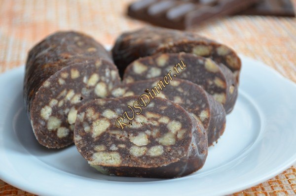 Шоколадная колбаска От автора: Шоколадная колбаска отличный десерт приготовленный в домашних условиях. Ингредиенты: Печенье - 600 гр. (любое песочное, например Юбилейное, К кофе) Масло сливочное - 200 гр. Какао порошок - 30 гр. (2 ст. л.) Молоко - 100 мл. Сахар - 180 гр. Орехи грецкие - 100 гр. Источник: https://rusdinner.ru/page/shokoladnaja-kolbaska