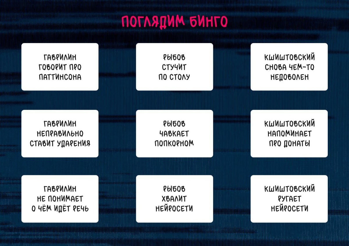 Нужны ваши великие умы. Накидайте пункты для «Поглядим Бинго», что по вашему мнению обязательно должно произойти на эфире? Не ограничивайте себя, набрасайте мыслей