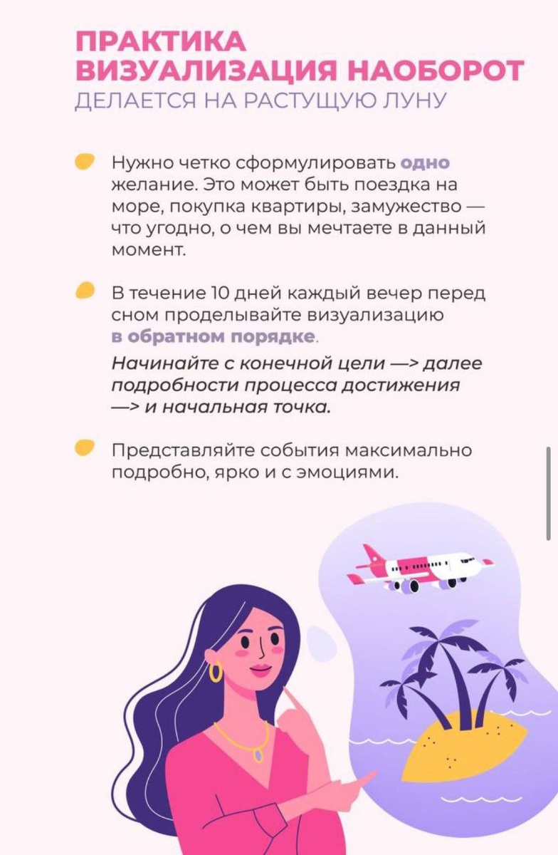 Сегодня хочу напомнить вам про технику «Визуализация наоборот» ✨✨✨ Знакомы с ней? Кто не знаком, обязательно попробуйте 🙌🏻 Эта практика не на один день, но тем интереснее. Можно начинать делать прямо с первого дня растущей Луны 🌙 В карточках правила выполнения. Пробуйте и делитесь впечатлениями 🤗
