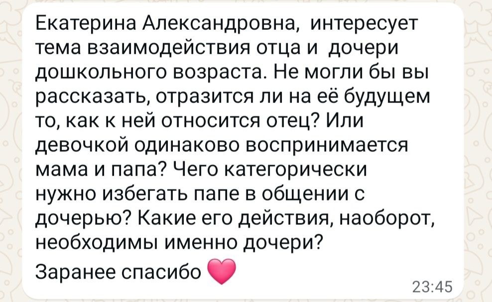 #ответнавопрос #отношения #воспитание #дети #папаидочка Ко мне в личку прилетел такой вопрос. Как папе воспитывать дочку (если сократить сообщение до основной сути)? В комментариях смотрите видео, которое мне очень откликается на тему воспитания отцом (нашла в сетях). На самом деле есть 2 момента. Папа- как родитель ребенка, вне зависимости от пола. И папа- как родитель дочки. Если взять в общем, чем папа отличается от мамы для ребенка. Мама- безусловное принятие и любовь. А папа- безопасность, защита и достижения. Но вопрос про папу, поэтому более подробно на эту тему. На самом деле, одним постом сложно объять эту фундаментальную тему, скажу лишь базу. Если кому будет важно раскрыть более подробно-пишите в комментариях. Папа для ребенка, для сына и для дочки: 1. Безопасность - я тебя не обижу и не предам, заступлюсь и защищу от внешней среды. Опора. 2. Стабильность - мои действия и поступки предсказуемы. Меня на эмоции сложно раскачать. 3. Зрелость - я взрослый. Я не самоутверждаю