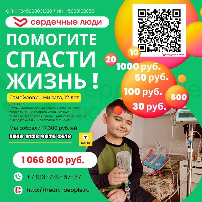 Заголовок: Мамы, наш долг — помочь Никите! Этот призыв — к вам, дорогие женщины, мамы, бабушки! У Никиты возникла острая необходимость в лечении, стоимость которого превышает возможности семьи. Мы верим в силу материнского сообщества, в нашу способность поддержать тех, кто оказался в трудной ситуации. Ваш репост может стать решающим! Не оставайтесь в стороне от детской беды. Помогите распространить информацию среди ваших знакомых. Как вы можете помочь: 💔 www.heart-people.ru 💔 + 7913-739-67-37 ( Сбербанк, Озон , Т-банк ) 💔 отправьте слово Никитка 300, на номер 3434. #краснодар #помощь