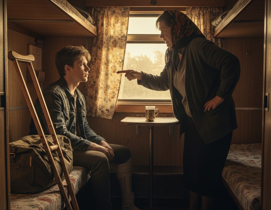 Вагон тянулся в ночную темноту, тусклый свет в купе отбрасывал мягкие тени на лица. Я зашла, увидела знакомую картину: парень с костылём устроился у окна, аккуратно положил повязку на колено, рядом — рюкзак, бутылка с водой, повязанная на костыль тонкая перчатка.