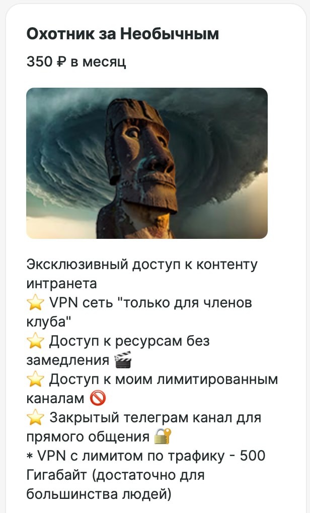 🚨 Друзья! Важно. В связи с последними блокировками моих (и не только) каналов напоминаю: у меня есть эксклюзивный клуб Охотников за необычным 🕵️♂️ 🔥 По подписке на отечественном сервисе Boosty вы получаете VPN-доступ к всему закрытому контенту. 💾 Это мой личный сервер, без логов, без слежки, только для друзей. Стоимость подписки — всего 350 ₽ в месяц. 💡 Подписка даст вам полный доступ ко всему контенту и одновременно поддержит развитие канала. Спасибо всем, кто уже с нами — вы настоящие охотники за необычным ❤️ Подключайте доступ по ссылке