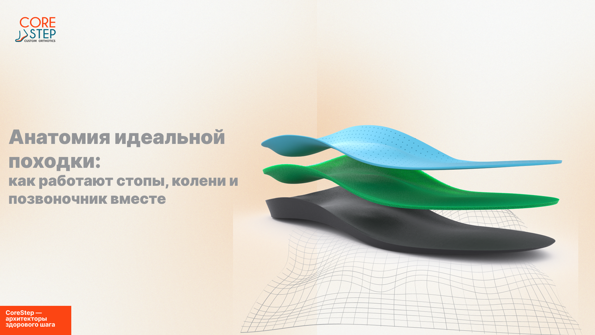 Каждый наш шаг — это не просто движение вперёд, а слаженная работа десятков костей, суставов и мышц, которые образуют цепочку: стопа → колено → таз → позвоночник. Если где-то возникает сбой, то проблемы возникают во всем скелете. Как устроена идеальная походка? Идеальная походка состоит из ритма, баланса и амортизации. При каждом шаге одна нога несёт вес тела, а другая готовится сделать следующий шаг. Основная задача — передать нагрузку плавно и равномерно, не создавая лишнего напряжения. В здоровой походке тело движется волной: 1. Стопа — принимает удар. 2. Колено — смягчает его. 3. Таз и позвоночник — удерживают баланс. 4. Мышцы корпуса — стабилизируют всё движение. Роль стоп Стопы являются настоящим фундаментом нашего тела: они первыми встречают поверхность и отвечают за амортизацию. При контакте с землёй пятка принимает основной удар, затем нагрузка распределяется по своду стопы, а подушечки пальцев завершают шаг, отталкивая тело вперёд. Когда свод стопы деформирован (плоскостопие,