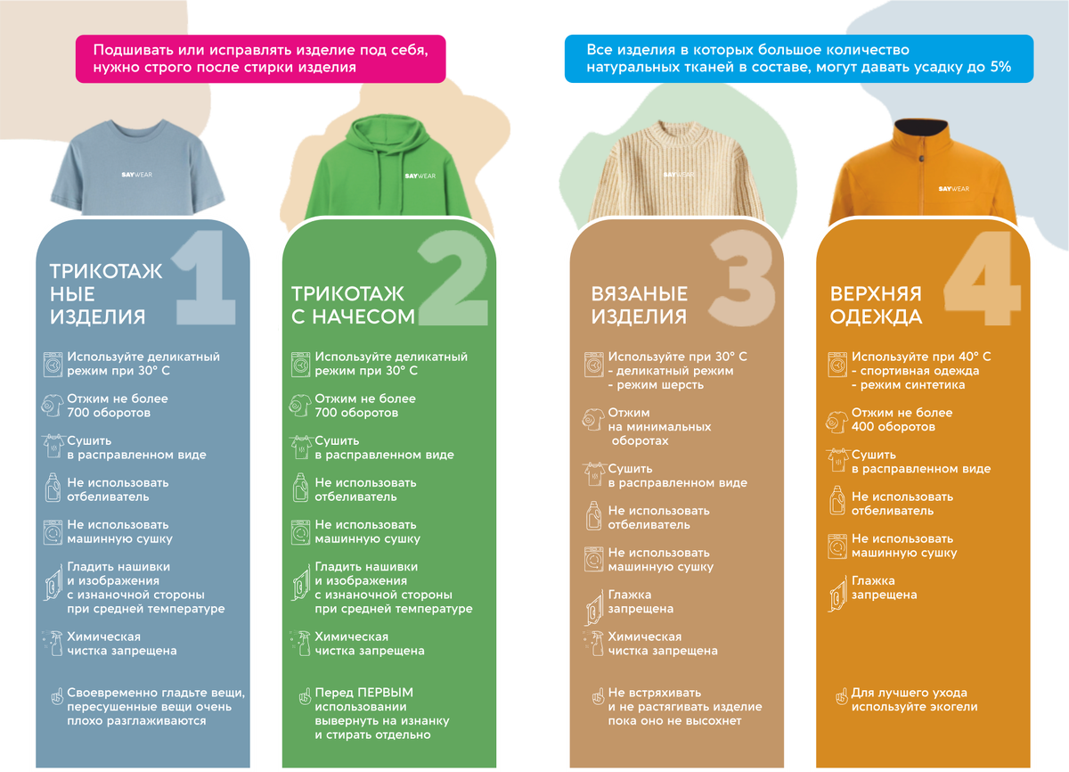 (и не превращалась в тряпку после третьей стирки) Мы все это делали. Бросали худи в стиралку с носками, включали “что-то тёплое” и потом удивлялись: — “А чего она села?” — “Почему цвет выгорел?” — “Где карман?” 😄 Одежда — как машина: если не ухаживать, быстро превращается в хлам. И не важно, купил ты вещь за 3000 или за 30 000 — всё зависит от того, как ты с ней обращаешься. Одежда SAYWEAR шьётся из натуральных тканей — плотный трикотаж, хлопок, лайкра, футер. Они дышат, держат форму и служат долго. Но даже такие материалы требуют уважения. Главная ошибка — стирка “наугад”. Если вещь любит деликатный режим, а ты включаешь “кипяток 60°”, это как если бы ты надел пиджак в спортзал. ✅ 1. Стирай на 30 градусов. Большинство наших изделий не любят жару. 30° — и всё чисто, без усадки и потери цвета. ✅ 2. Без отжима на 1200. Не крути вещи как вертолёт. Достаточно 600–800 оборотов, и ткань останется плотной. ✅ 3. Переворачивай наизнанку. Это спасает цвет, особенно у чёрных и тёмных вещей. ✅ 4.