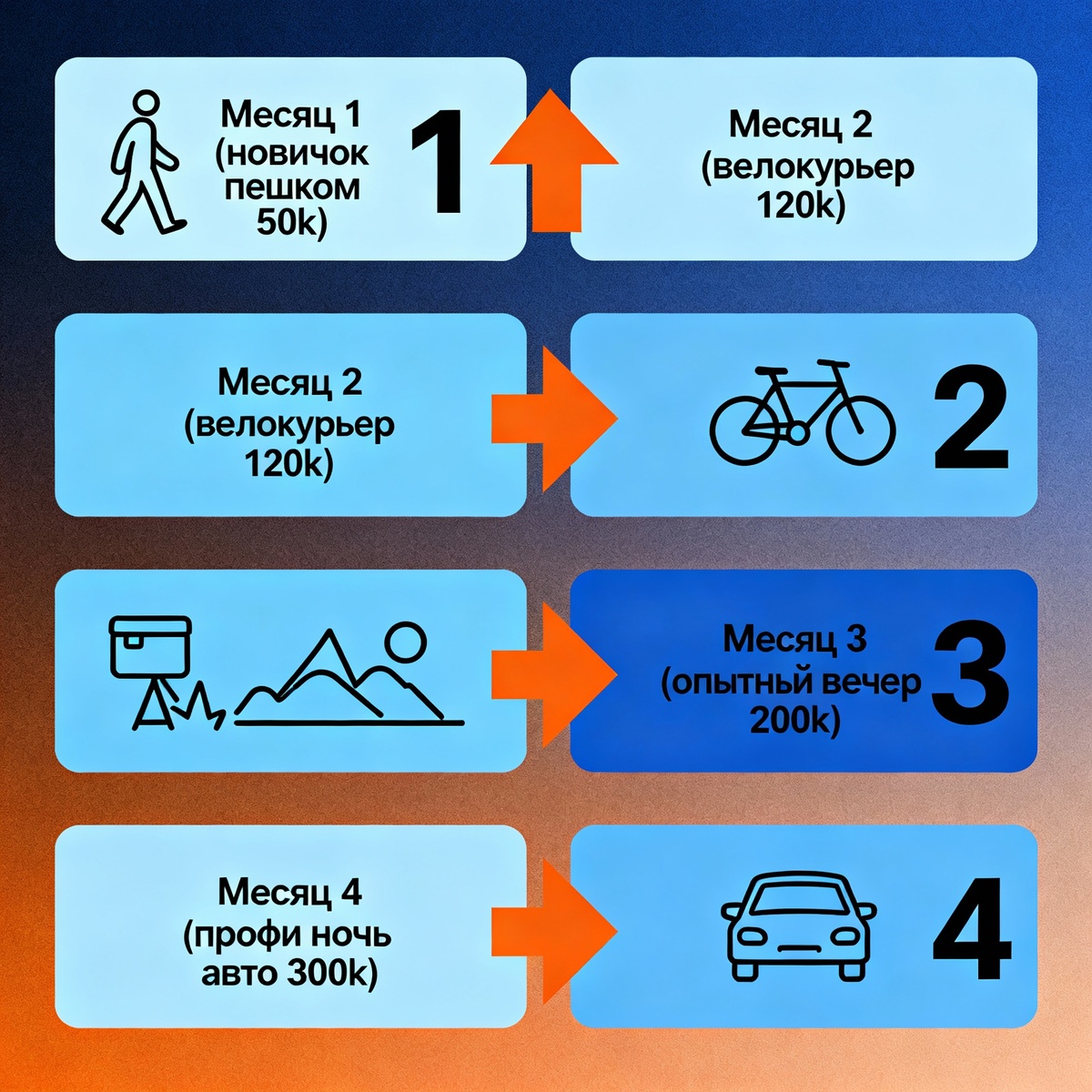 Вывод: Максимальный сценарий даёт невероятный доход, но требует опыта, авто и готовности работать ночью.