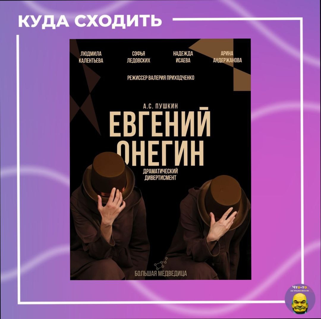 Спектакль «ЕВГЕНИЙ ОНЕГИН»🎭 Заколдованный дивертисмент, созданный на основе романа Александра Пушкина, с сохранением сюжета и главных действующих лиц, где воедино соединяются поэзия, движение и музыка. Уникальность этого спектакля в том, что его создавали пять женщин (четыре актрисы и режиссёр), глубоко исследуя человеческую природу любви, дружбы, верности, разочарования и смирения, что позволило истории зазвучать современно и актуально. 📅Когда: 3 ноября в 17:00 📍Где: АССР театр-студия АНФАН ТЕРРИБЛЬ (ул. Минаева, 6) #куда_пойти_ул