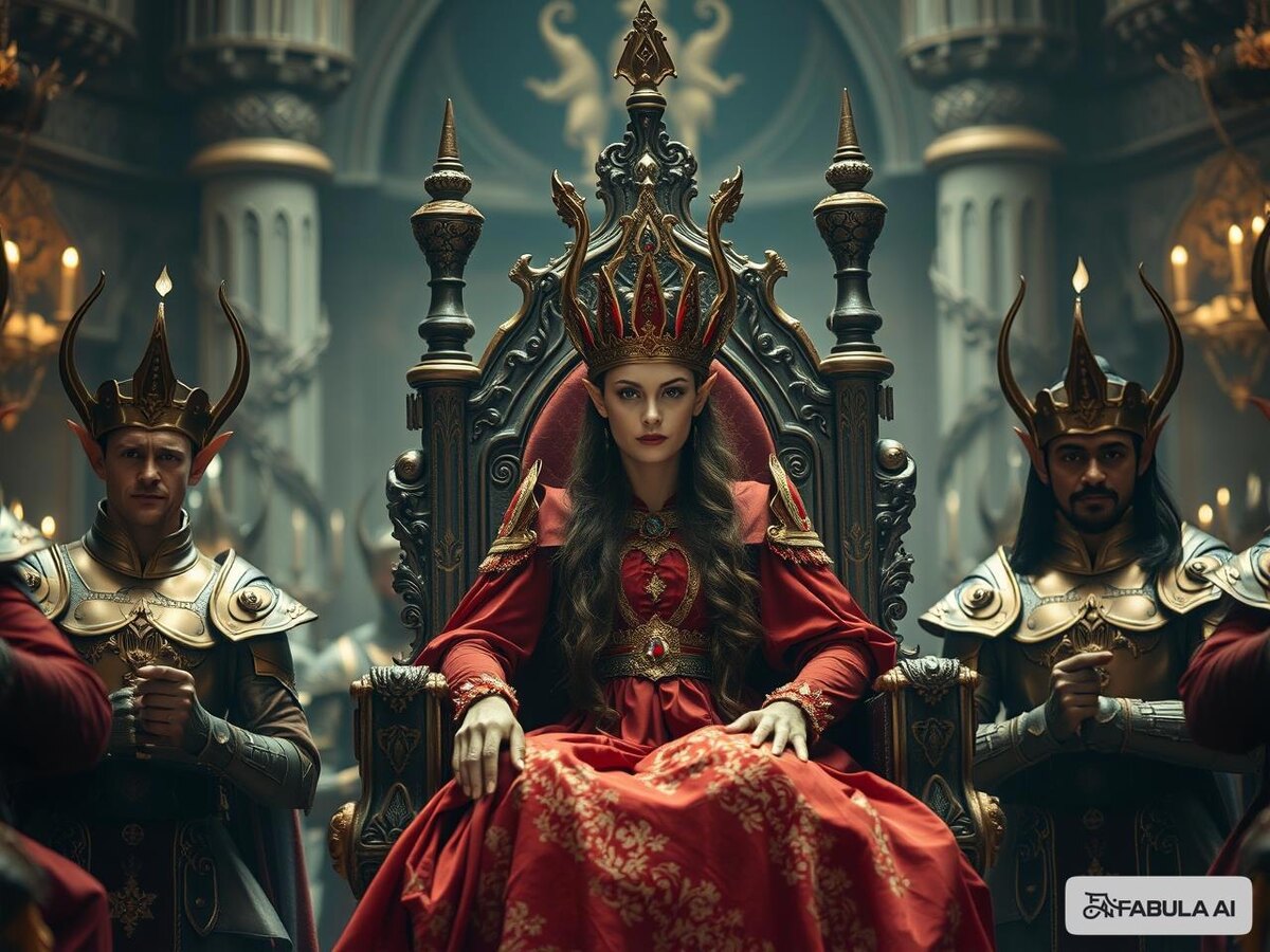 Побаловался немного с нейросетями и вот такие получились картинки. Что позволит оценить различные нейросети. Если кому то нужно, как иллюстрации, можно свободно использовать. Запрос ИИ был сделан на королеву в красном, с придворными и охраной. И вот результат.