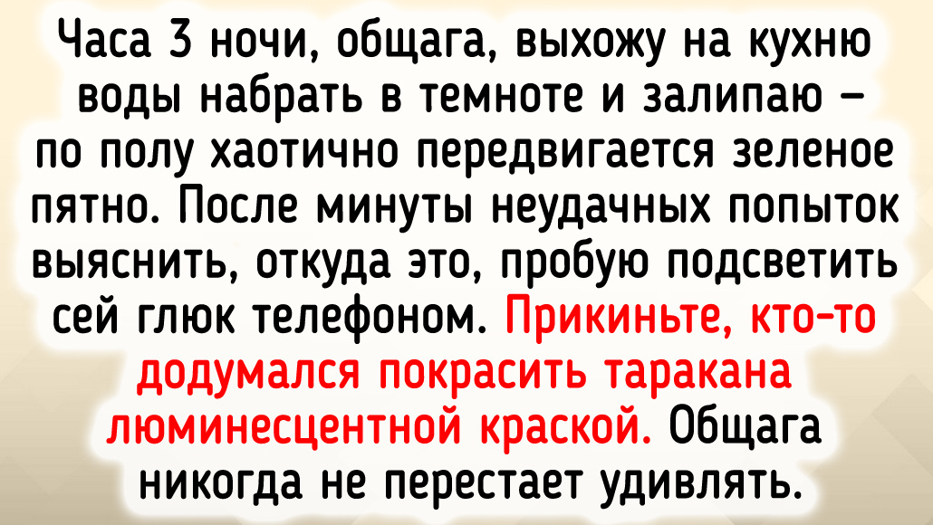 Часа 3 ночи, общага, выхожу на кухню воды набрать в темноте и залипаю — по полу хаотично передвигается зеленое пятно. После минуты неудачных попыток выяснить, откуда это, пробую подсветить сей глюк телефоном. Прикиньте, кто-то додумался покрасить таракана люминесцентной краской. Общага никогда не перестает удивлять. © Jekooo / Pikabu