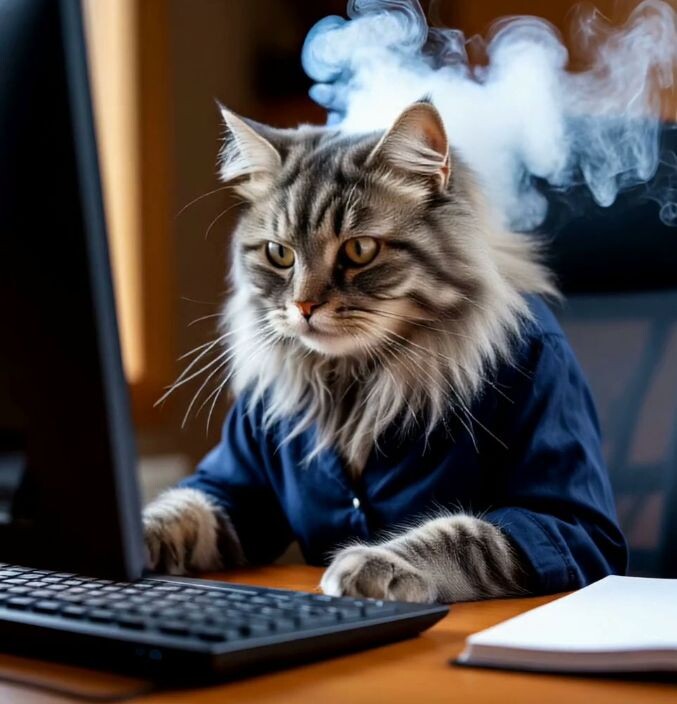 Поскольку сократилась только зарплата, а объём работы остался прежним, домой я прихожу хоть и пораньше, но как выжатый лимон. Нет сил не только писа́ть, но даже смотреть чужие публикации. Стала замечать, что их просмотр я откладываю либо на поздний вечер, либо на раннее утро. Голова моя дымится, как у кошечки на фото.