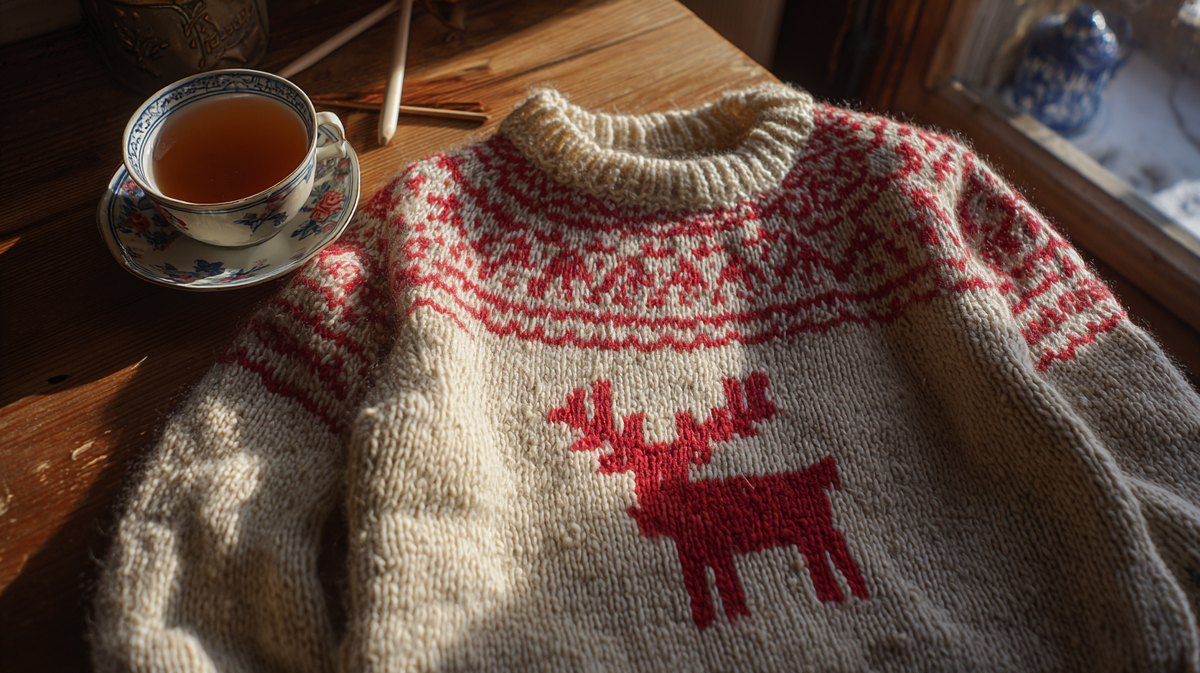 - Соединяем тело и рукава в кокетку: тут можно бахнуть узоры — косы, олени, снежинки, сраные звёзды — всё, что бабка любила.