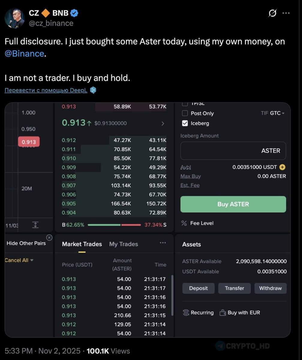 🔼Чанпэн Чжао: «Я только что купил #ASTER на свои собственные деньги. Я не трейдер. Я покупаю и держу»