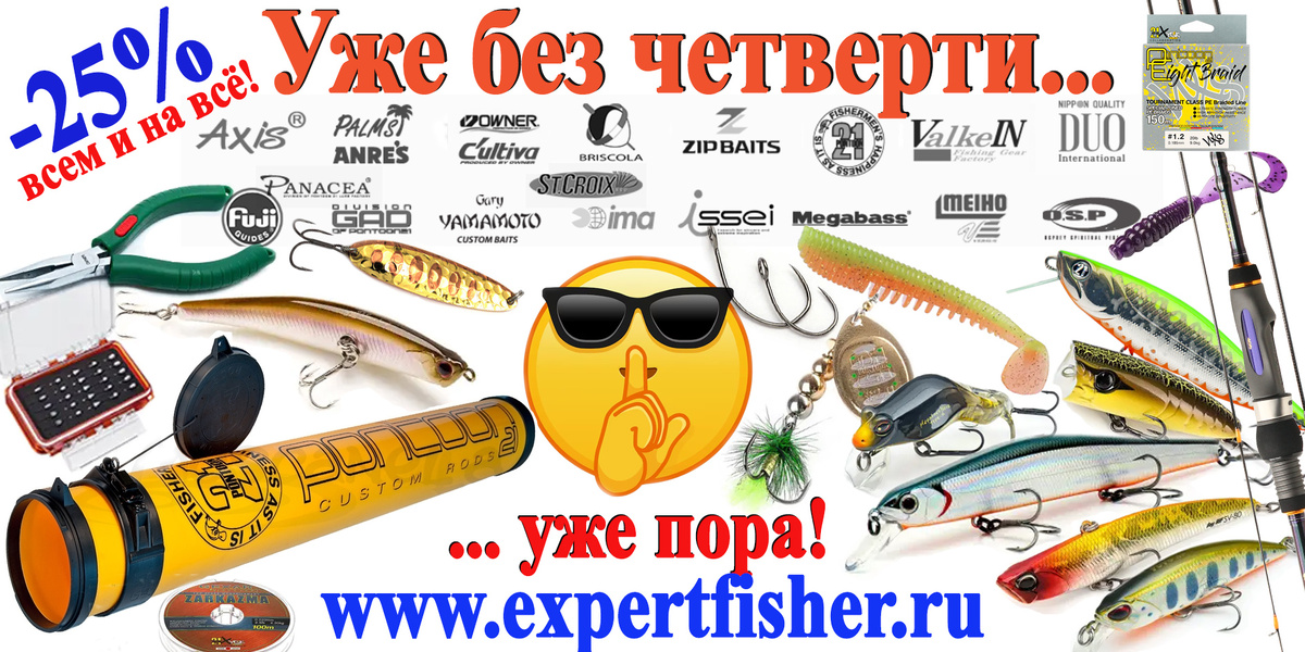 Неважно, как, когда и почему одну ноябрьскую пятницу называли «чёрной». Историй много, смысл один: начало подготовки к новогодней кутерьме. А это процесс приятный и нервный, весёлый и серьёзный, суетливый и сосредоточенный, для себя и для друзей… И так не хочется терять время (да и некогда) и вчитываться в условия в стиле «купи мешок того – тогда получишь горсточку этого» или в таком духе. «Рыболов-Эксперт» упрощает всё – и всё, что есть на сайте www.expertfisher.ru вы можете заказать со скидкой 25%. А что там есть для вас? А то, что вы успеете положить в корзину, опередив других (снасти, как и «пятницы» имеют привычку однажды заканчиваться): ! Удилища: спиннинговые, кастинговые, фидерные, поплавочные – во всём разнообразии длин, тестов и специализации. Все они проверены многими уловами и многими рыболовами! !! И ещё бланки для удилищ разных серий Pontoon21 – для самостоятельной сборки. ! Приманки: воблеры на любой вкус, вращающиеся и колеблющиеся блёсны, приманки из мягкого пластика.