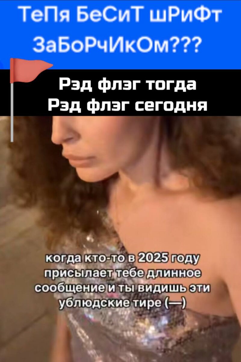 🫠 Зумеры рвут отношения из-за... длинного тире. Ты открываешь мессенджер и видишь сообщение: «Дорогая — ты самое лучшее, что со мной случалось в жизни»? Романтично? Нет, повод задуматься, считают пользователи интернета. Зумеры объявили длинное тире — черной меткой, которая выдает с потрохами любителя нейросетей, отдающего на аутсорс любое маломальское задание. 🤣 — Теперь есть официальный предлог для разрыва. 📍Подписывайтесь на Инфо24 | Прислать новость