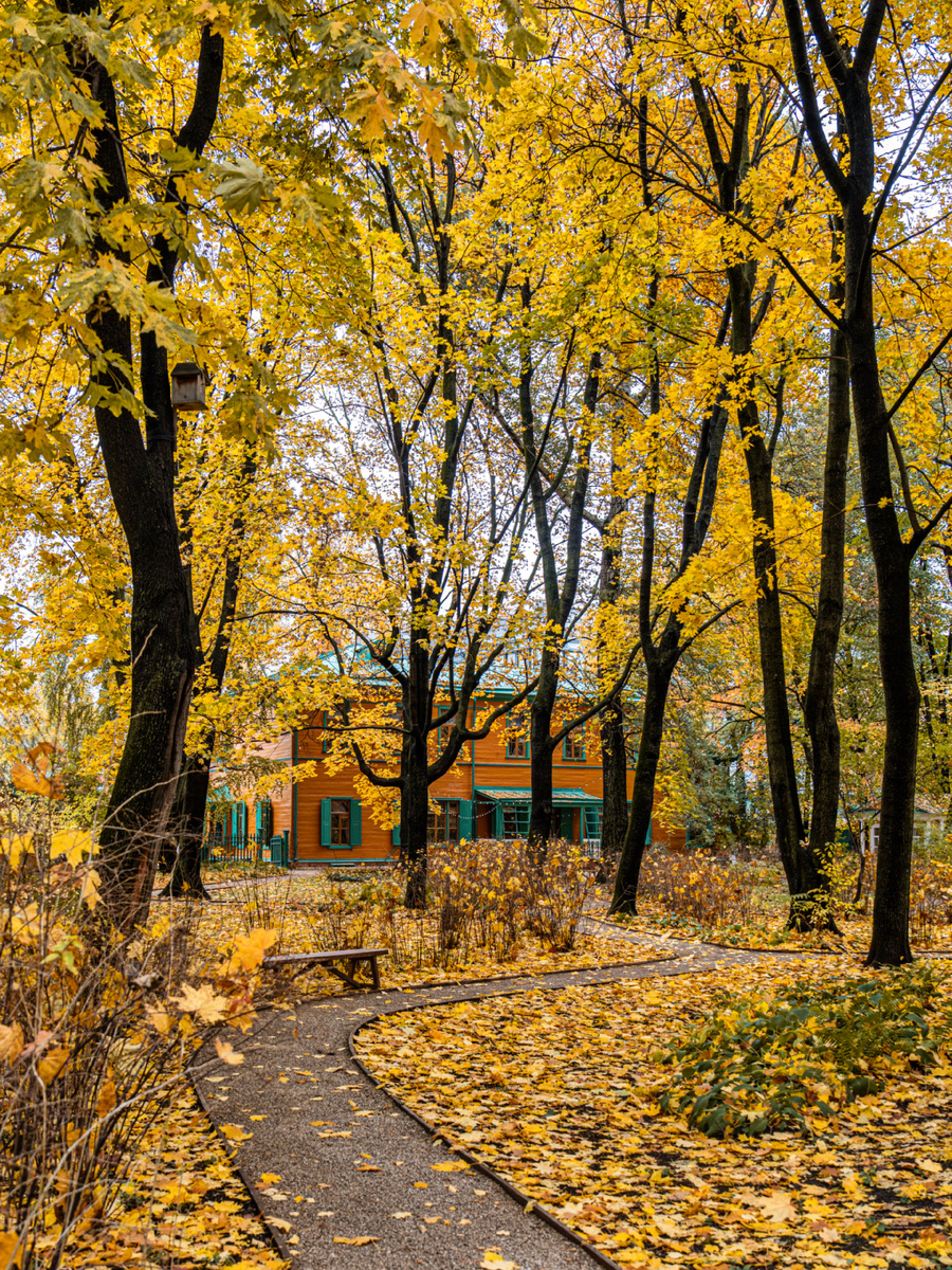 Перед вами замечательный сад усадьбы Льва Толстого в Хамовниках. Осенью он особенно прекрасен! Сад и деревянный дом сохранился с того времени, как здесь жил писатель с семьей. Лев Николаевич купил усадьбу в 1882 году и прожил здесь 19 зим. Дом с огромным садом в 1 гектар, засаженным малиной, крыжовником и яблонями, напоминал Толстым их деревенский дом в Ясной поляне, куда они всегда уезжали на лето. В саду стоит беседка с колоннами – любимое место отдыха Толстых, также здесь есть насыпной холм с лавочкой на вершине – любимое место для размышлений писателя. Главный дом усадьбы в Долго-Хамовническом (старое название улицы Льва Толстого) переулке был построен в 1805 году при князе Иване Мещерском. Несмотря на то, что был деревянным, он пережил пожар 1812 года и на момент покупки старинной усадьбы Толстыми обветшал, но выстоял. Однако, дом был одноэтажным и не мог вместить большую семью писателя. В связи с этим Лев Николаевич затеял его перестройку, расширив первый этаж и достроив втор
