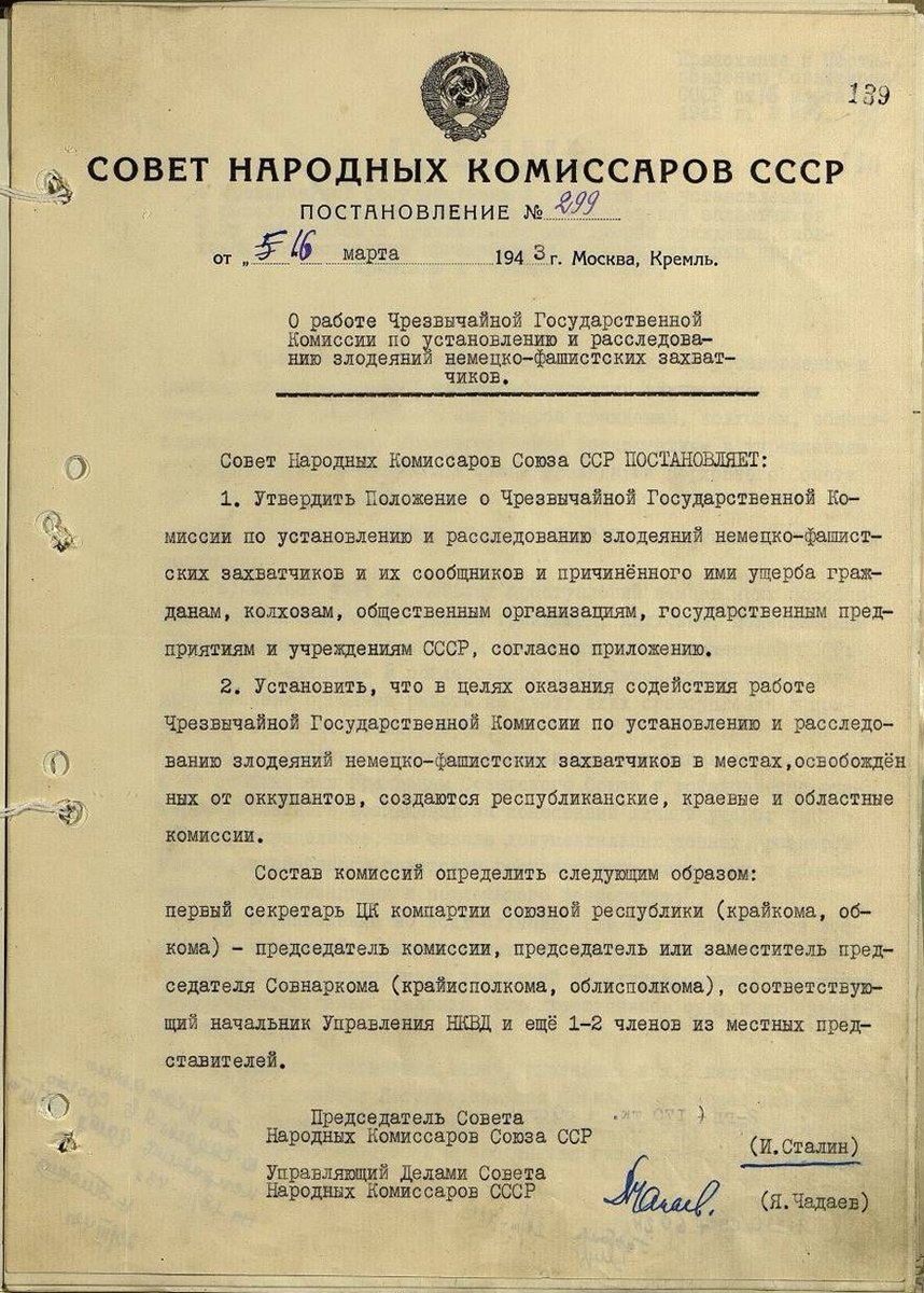 2 ноября 1942 года в СССР была создана специальная комиссия для расследования преступлений, совершенных нацистами на оккупированных