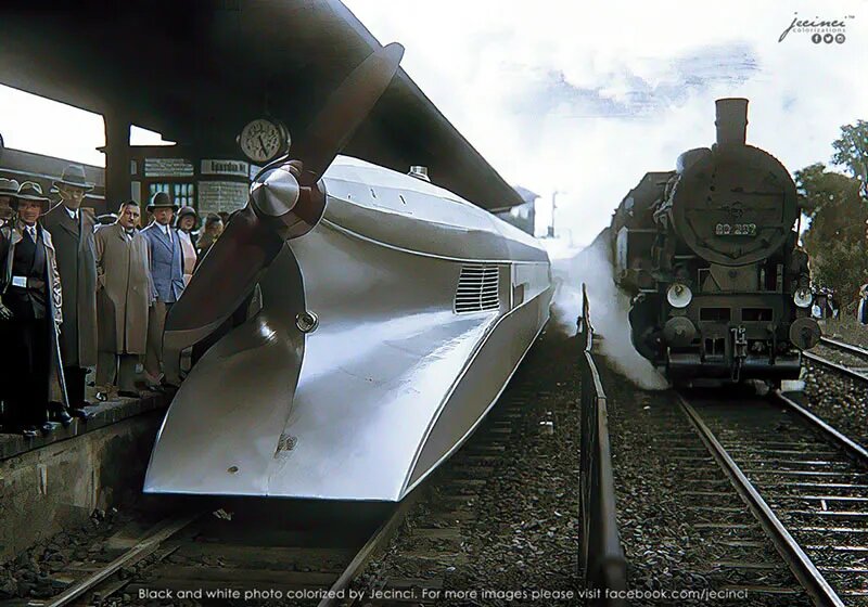 Так появился необычный прототип — лёгкий, обтекаемый вагон из алюминия с огромным авиационным винтом сзади, который должен был толкать состав вперёд. Идея казалась безумной, но Крукенберг верил: минимальное сопротивление воздуха и мощный двигатель позволят поезду развивать скорость, недоступную обычным локомотивам. Schienenzeppelin действительно напоминал самолёт без крыльев.
