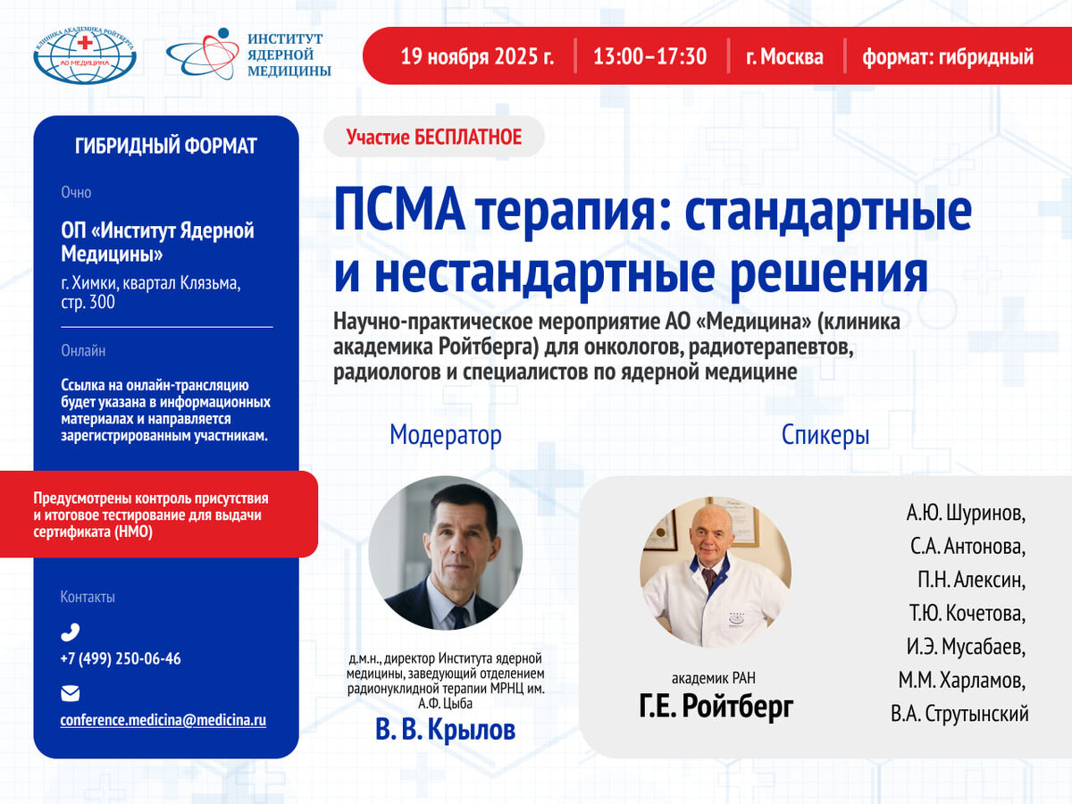 📅 Дата: 19 ноября 2025 г. 📍 Формат: очный (аудиторный) или онлайн 🕰 Время проведения: 13 до 17.30 Место проведения: ОП «Институт Ядерной Медицины», г. Химки, квартал Клязьма, стр. 300 Участие в конференции БЕСПЛАТНОЕ. Предусмотрены контроль присутствия и итоговое тестирование для выдачи сертификата (НМО). 📌Регистрация по ссылке: https://my.mts-link.ru/j/14625295/4253222028