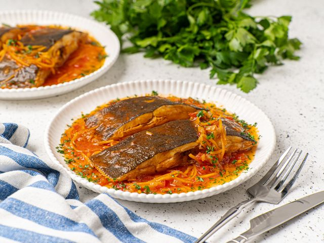 Камбала — нежная морская рыба с мягким, слегка сладковатым вкусом и плотным белым мясом. Она богата белком, фосфором и омега-3 жирными кислотами, при этом практически не содержит лишнего жира. Один из лучших способов подчеркнуть её вкус — приготовить камбалу в насыщенном томатном соусе с пряностями и овощами. Такое блюдо подходит как для повседневного обеда, так и для ужина в кругу близких: ароматное, полезное и невероятно вкусное. Этап 1. Подготовка рыбы Камбалу очистите от кожи и внутренностей, если используете целую тушку. Нарежьте на порционные куски, промойте и обсушите бумажным полотенцем. Посолите, поперчите, при желании сбрызните лимонным соком — он придаст рыбе легкую кислинку и устранит возможный морской запах. Оставьте мариноваться 10–15 минут. Этап 2. Обжарка Разогрейте сковороду с растительным маслом и обжарьте кусочки камбалы с двух сторон до золотистой корочки. Не стоит готовить слишком долго — рыба должна лишь слегка подрумяниться. Переложите ее на тарелку и займитесь с